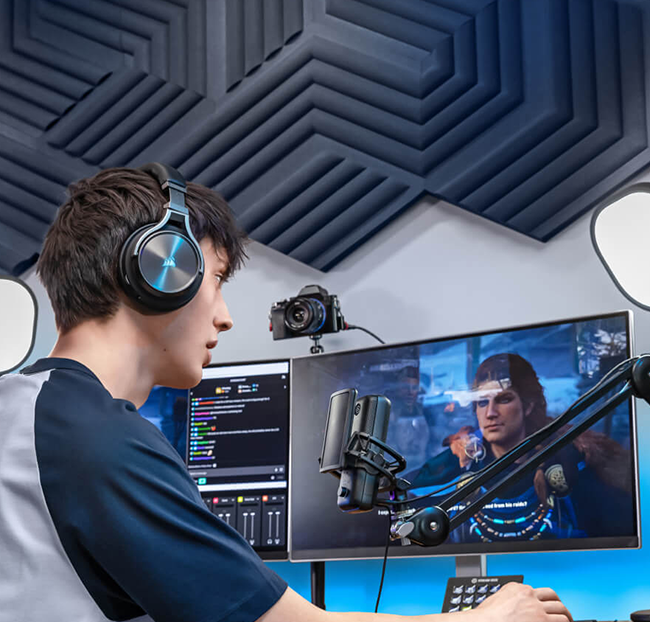 Geribbeld schuim met een lage dichtheid dempt de hoge tonen, vezels met een hoge dichtheid temmen de midden- en lage tonen en een verborgen luchtcapsule houdt nog meer geluid vast. Het resultaat is een volledige toonbalans voor superieure uitzendingen en luistersessies.